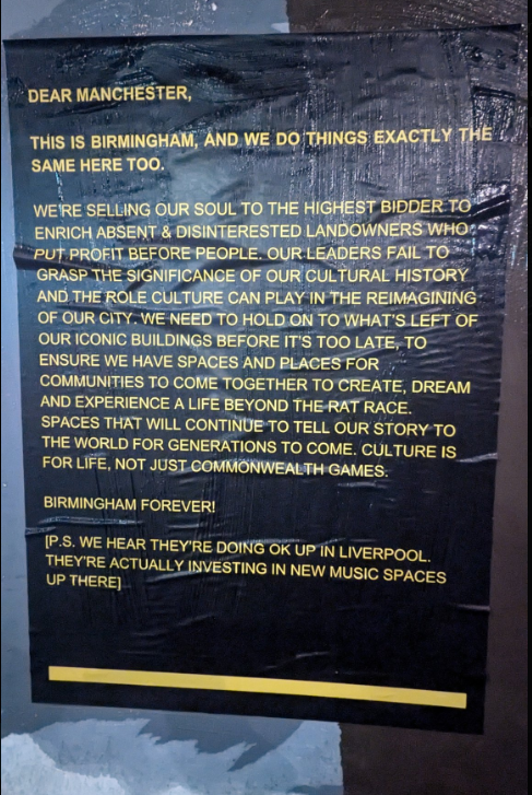 After a mysterious yellow poster sparked a huge debate in Manchester by accusing the city of selling its "soul" in pursuit of breakneck growth and development, a copycat has emerged in Birmingham. This poster, which is on the side of Station Street's The Crown pub, suggests the city’s leaders are failing to preserve its cultural heritage, instead favouring distant property developers and their cash. What do you think? Have your say in the comments.