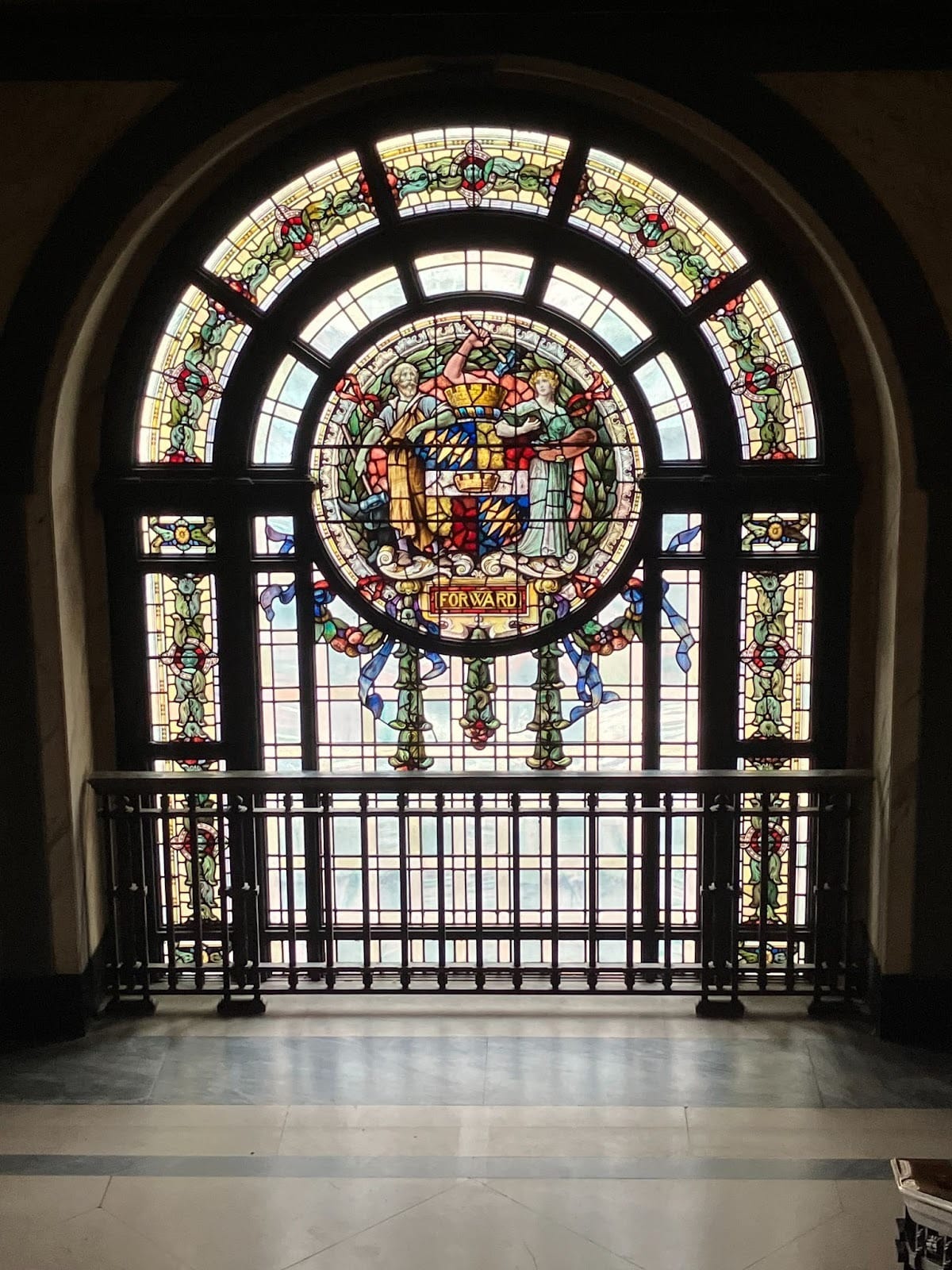 A stained glass window at the back of Birmingham Museum and Art Gallery, near the new Staffordshire Hoard exhibit. Can you tell us about this window’s history? Who made it? And why?