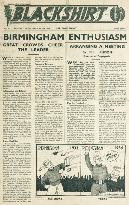 In January 1934, Oswald Mosley gave a dramatic speech in Birmingham. Thousands of Fascists, including contingents coached in from London and elsewhere, gathered at the BUF’s Birmingham Headquarters, and marched to Bingley Hall in the city centre. The British Union of Fascists’ newspaper, Blackshirt, described how, after a dinner of cold beef and ham for the party faithful, an 8,000-strong crowd chanted ‘M-O-S-L-E-Y’. Despite heckling from anti-fascists – which the Blackshirt explains was ‘nipped in the bud’ – Mosley spoke of how ‘decrepit political parties’ had failed and that only ‘the forward march of Fascism’ could make the country strong once again.