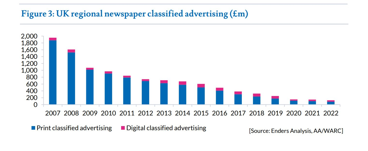Why is it happening? A mix of big economic forces and bad decisions. In the pre-internet era, local newspapers made handsome revenue from local advertisers. Nowadays, most of that revenue has dried up: as Kirsty Bosley noted in her brilliant piece about Wolverhampton’s Express and Star, “classified” advertising in local papers (car ads, job ads, homes ads etc) has fallen 96%, from £2.1 billion in 2004 to less than £100m (see graph below). That’s an astonishing loss of revenue for newspapers and has resulted in massive layoffs almost every year across the country.