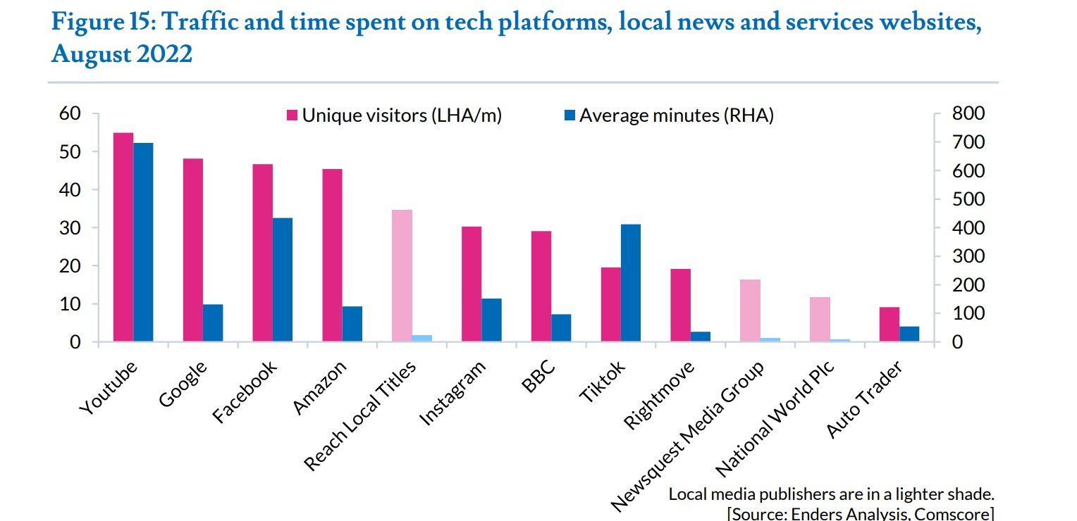 There is brilliant public interest journalism still being done by local reporters working for these sites, like this story by Birmingham Live’s Nathan Clarke about a 90-year-old woman who had to travel by bus for an hour to visit a food bank. Or Jane Haynes’ diligent reporting on the state of social housing. And the paper is committed to highlighting the chronic issue of road collisions happening across the city. But the website makes it a pain to stay on the page for longer than a few moments, which explains why the actual time that people spend on Reach’s local sites is so low (see the extraordinary graph from Enders Analysis below).