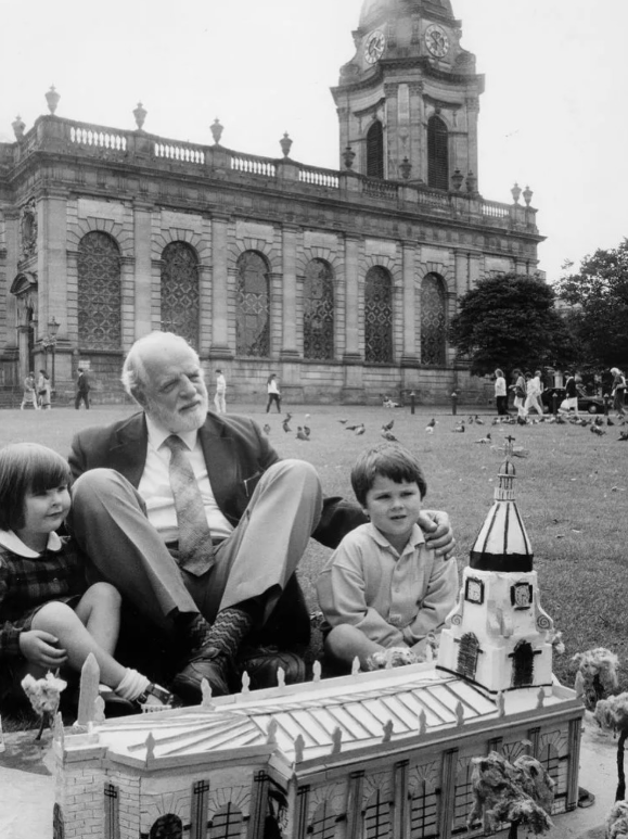 Photo: @birminghamhistory (Instagram). Alan Lamb, Birmingham Cathedral Education Officer, shows Benjamin and Clare Hemmings a model of St Philip’s created by a year 6 class at Bromford Junior School, 1987.