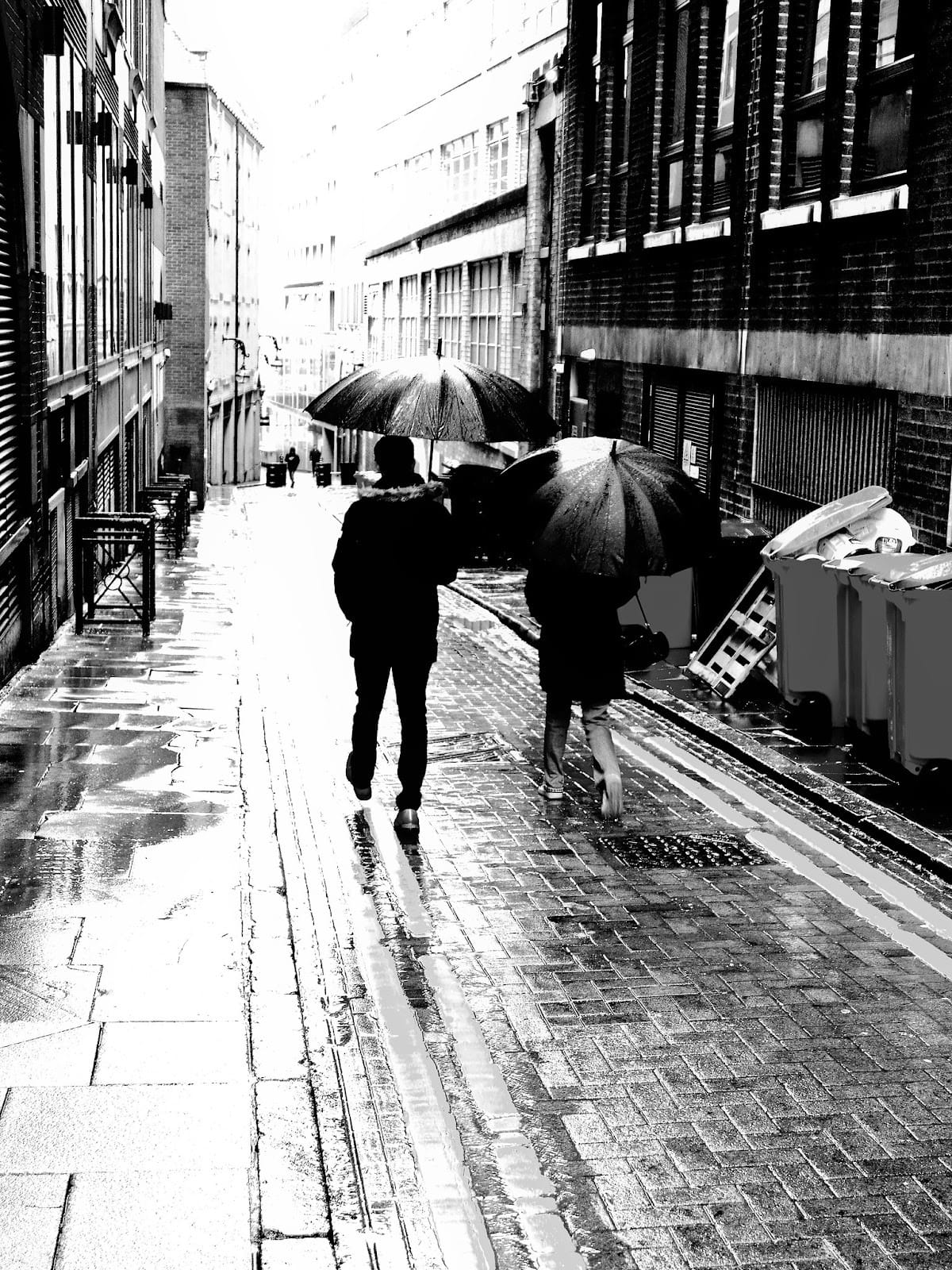 Local photographer Mac McCreery recently captured this rain-soaked shot of “a two umbrella household pootling down Needless Alley”.