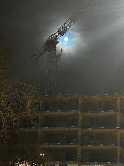 John Brabbins, landlord at The Craven Arms in central Birmingham, sent us this haunting picture of the ongoing development on Upper Gough St. With the moonlight peeking through the skeleton of a crane and multi-story yet-to-be-completed, it could be a scene out of a crime noir.
