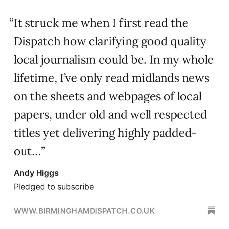Our subscriptions and pledges have supercharged since publishing this piece. From the messages people have been leaving, it has chimed with readers who are frustrated by the ad-laden local journalism that has become the norm. And I’m glad I was able to get across my argument clearly. Thanks to Andy for this message: