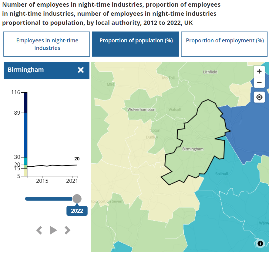 Data check: 223,329 people are working in Birmingham’s NTE — more people than at any point in the last 10 years. This accounts for all people working in such businesses at any time of the day, not just in the evening. That’s a significant proportion of employed people in the city — 20% to be exact. (Although this is lower than Manchester’s 31%.)