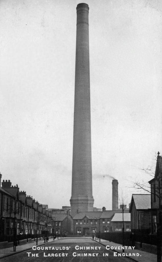 By the 1980s, the textiles industries were looking east, particularly to East Asia, for production. Courtaulds eventually merged with competitor Akzo Nobel (we approached Akzo Nobel to respond to this story but they did not reply). As the company moved away from Coventry, the Courtaulds name became all but defunct. The chimney that dominated the Coventry skyline for 100 years was finally demolished in 2010, and housing, flats, and office suites now take up most former Courtaulds sites in Coventry.