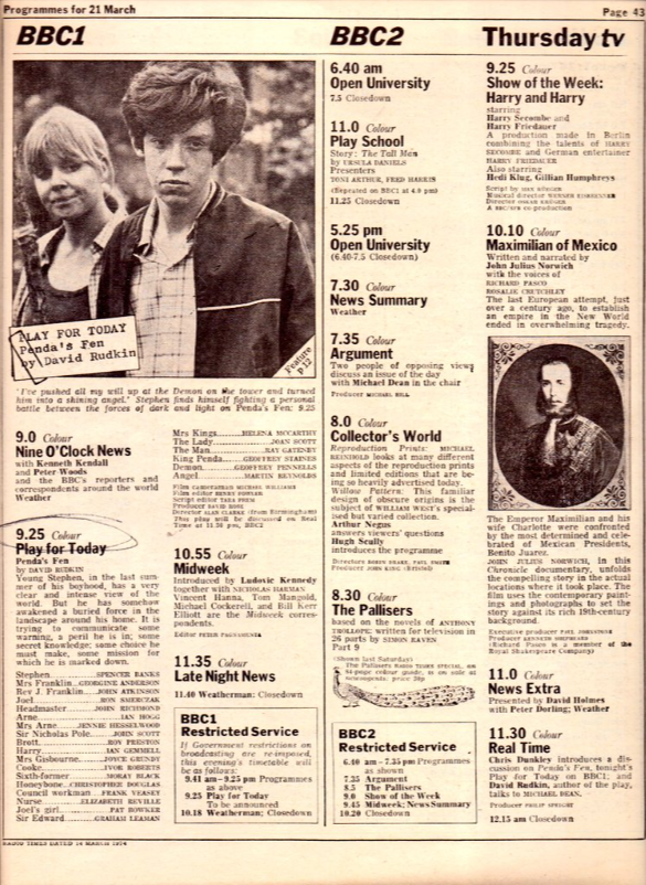 Ian Greaves, the author of Penda’s Fen: Scene by Scene agrees, telling me that: “Rudkin was asked about the term [folk horror] and dismissed it, saying 'it's a bloody political play.' Which I think it is.” Greaves elaborates that Penda’s Fen: “deals with unions, moral pressure groups, pollution, education...all sorts of things that resonated with viewers in 1974 and can still do so today.”