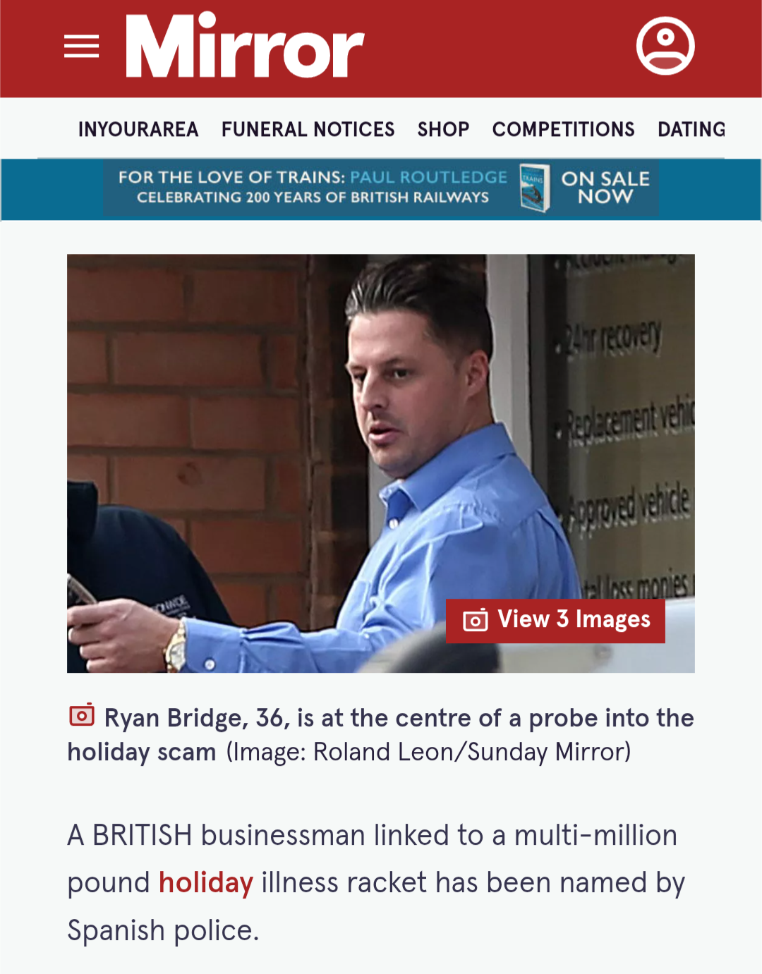 What is available on Companies House are records of a selection of businesses created by Bridge, all operating in the compensation claims arena. In 2016 he launched UK Holiday Claims Ltd, although it was dissolved two years later without filing any accounts. This was around the time the news emerged that Spanish police were investigating Bridge and seven other Brits alleged to have scammed hotels in Magaluf between 2016 and 2017. The group is suspected of helping British tourists to make bogus compensation claims for food poisoning via a WhatsApp group called UK Holiday Claims, in return for a cut of the money. The court instruction names Bridge as one of the people in the UK who was in charge of processing the false claims gathered in Mallorca.