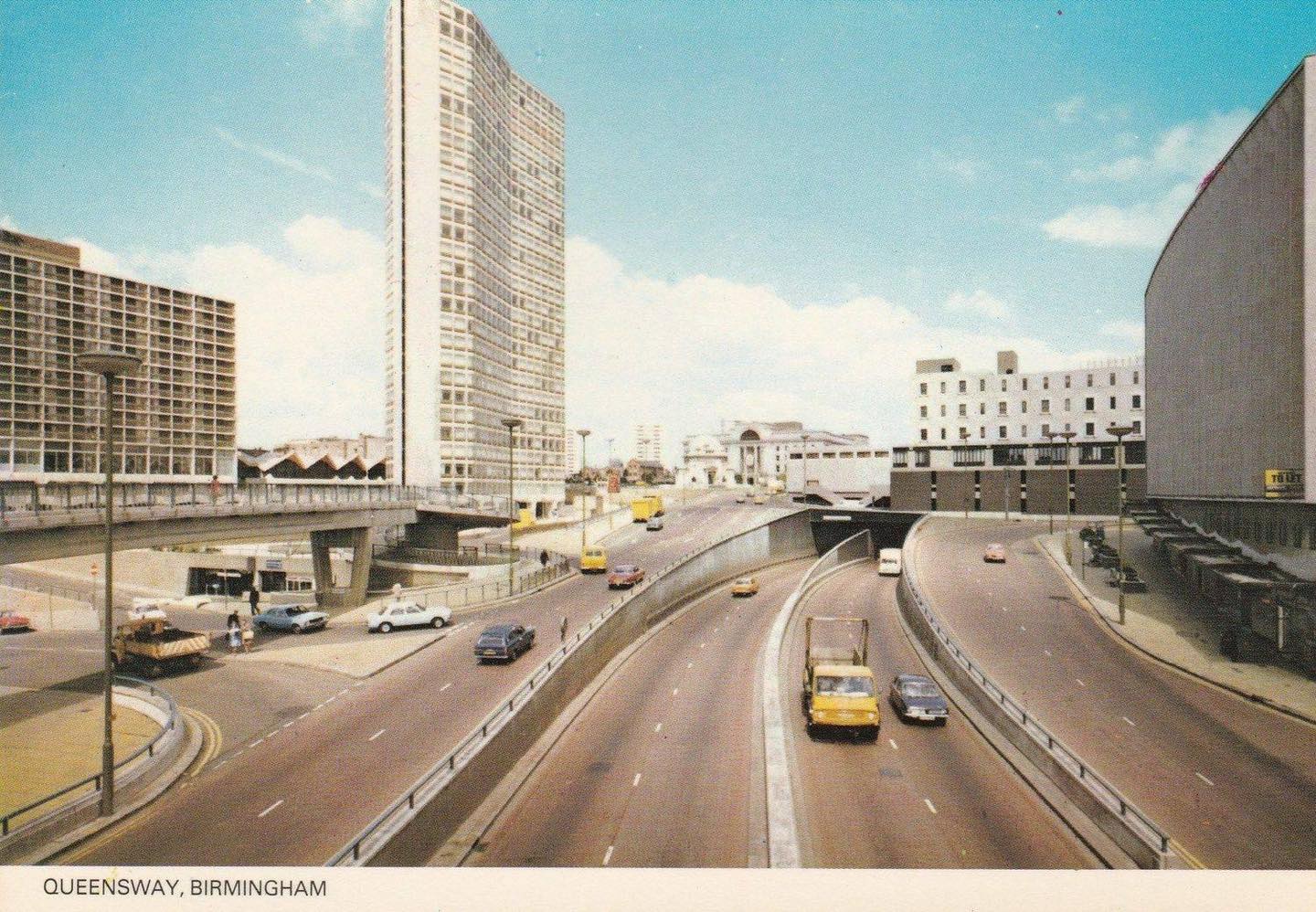 At a sodden Spaghetti Junction, a Mini Clubman descends from the M6 to the Aston Expressway. These roads have been open barely a year, but already look much older. Visible in the background are the grime-blackened cooling towers of Nechells Power Station, standing roughly where Star City does today, and, next to the Expressway, rows of factory rooftops. The 20-year-old tower-blocks of the Holte & Priory Estate also interrupt the skyline. Austin Maxis and Triumph Dolomites trundle past. A van has broken down in the far lane.