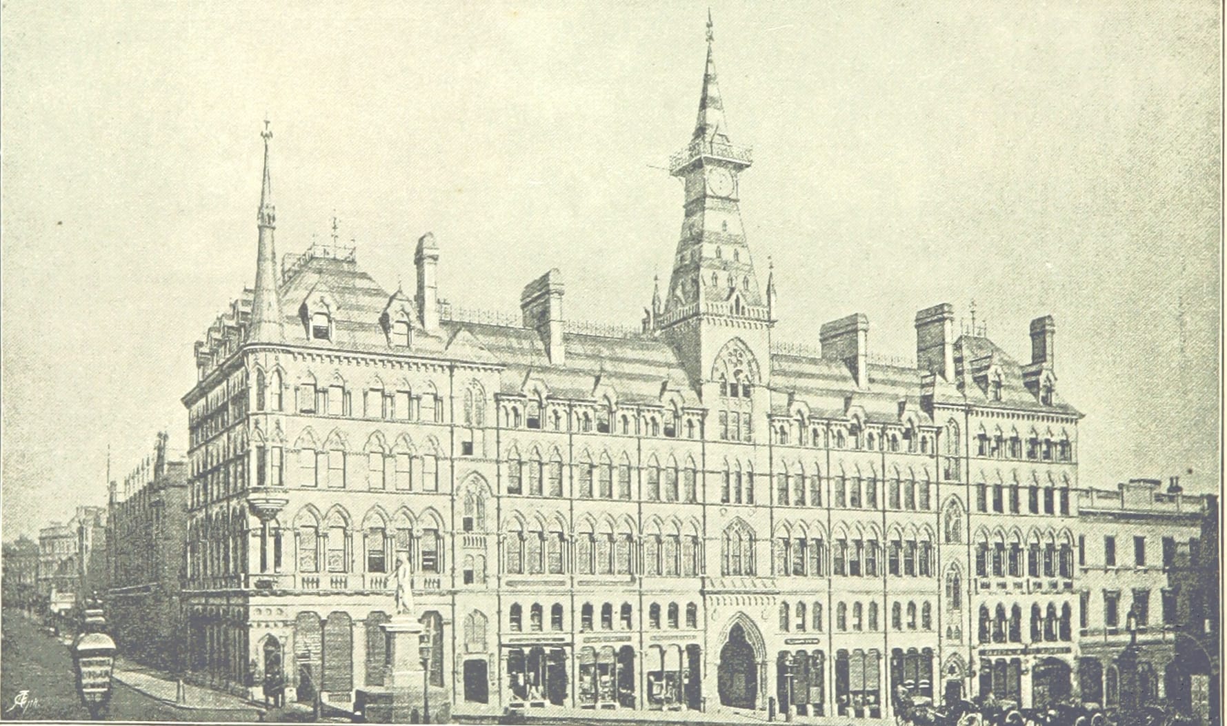 Exiting via the main route out onto Stephenson Street, the splendour was sustained at the front, where the six storey, Italian-style Queen’s Hotel which was designed by William Livock and built in 1854, joined up with the station.