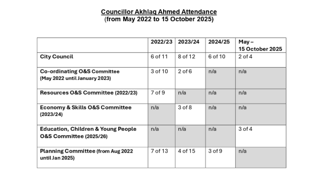 Another resident, Andrew Lydon, sent a Freedom of Information request to the council, asking about Ahmed’s attendance between May 2022 and October 2025. The response shows that the number of committees Ahmed sits on has been reduced from three to one in that time, but overall, he has attended just 36 out of 74 meetings across the three years. The Dispatch understands that some of these absences are due to bereavements which occurred in 2022.