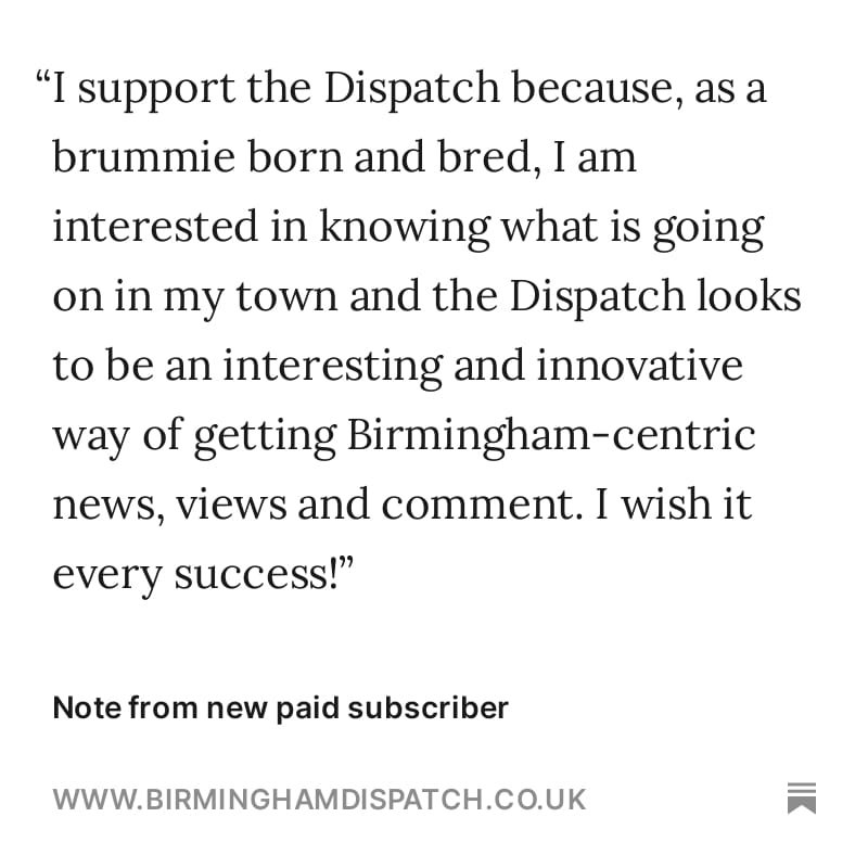 Yesterday’s paid membership launch was exciting — slightly scary, but ultimately very successful — thank you to everyone for all your sharing and enthusiasm. We’ve hit the ground running and already have 170 paying subscribers which is brilliant. We are still riding high on the good vibes, to be honest, but your regular Brum in Brief awaits below. In the meantime, do continue to share us with friends and followers if you haven’t already, by clicking the green button below.