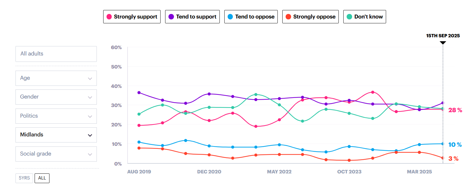 Opinion check: It appears that Westminster has voters in the region on side too. The graph below tracks the level of support from Midlands residents for the move — around 60% are in favour.